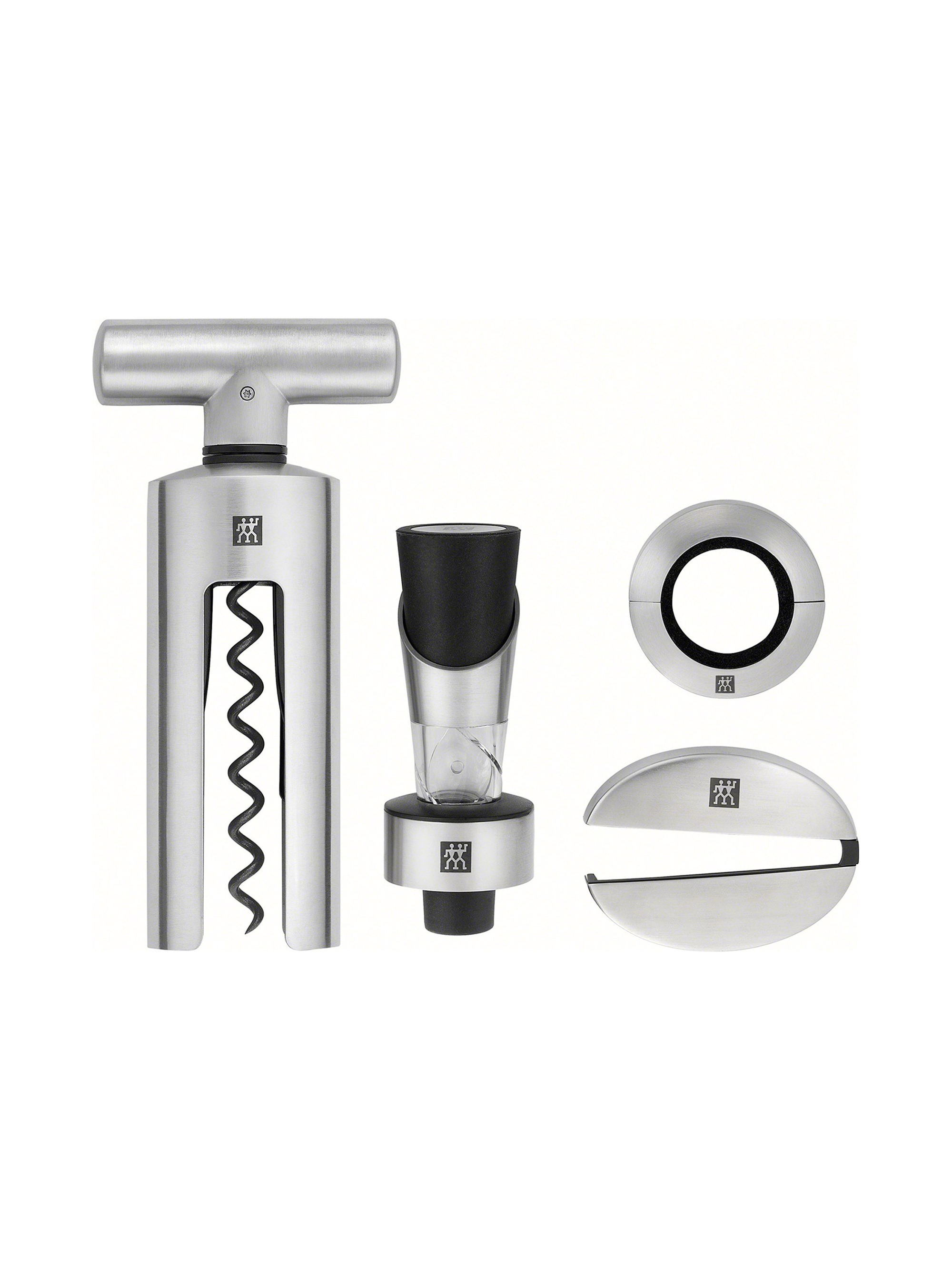 - Korkenzieher, Folienschneider, Ausgiesser und Topfring garantieren eine kultivierte Weinverkostung
