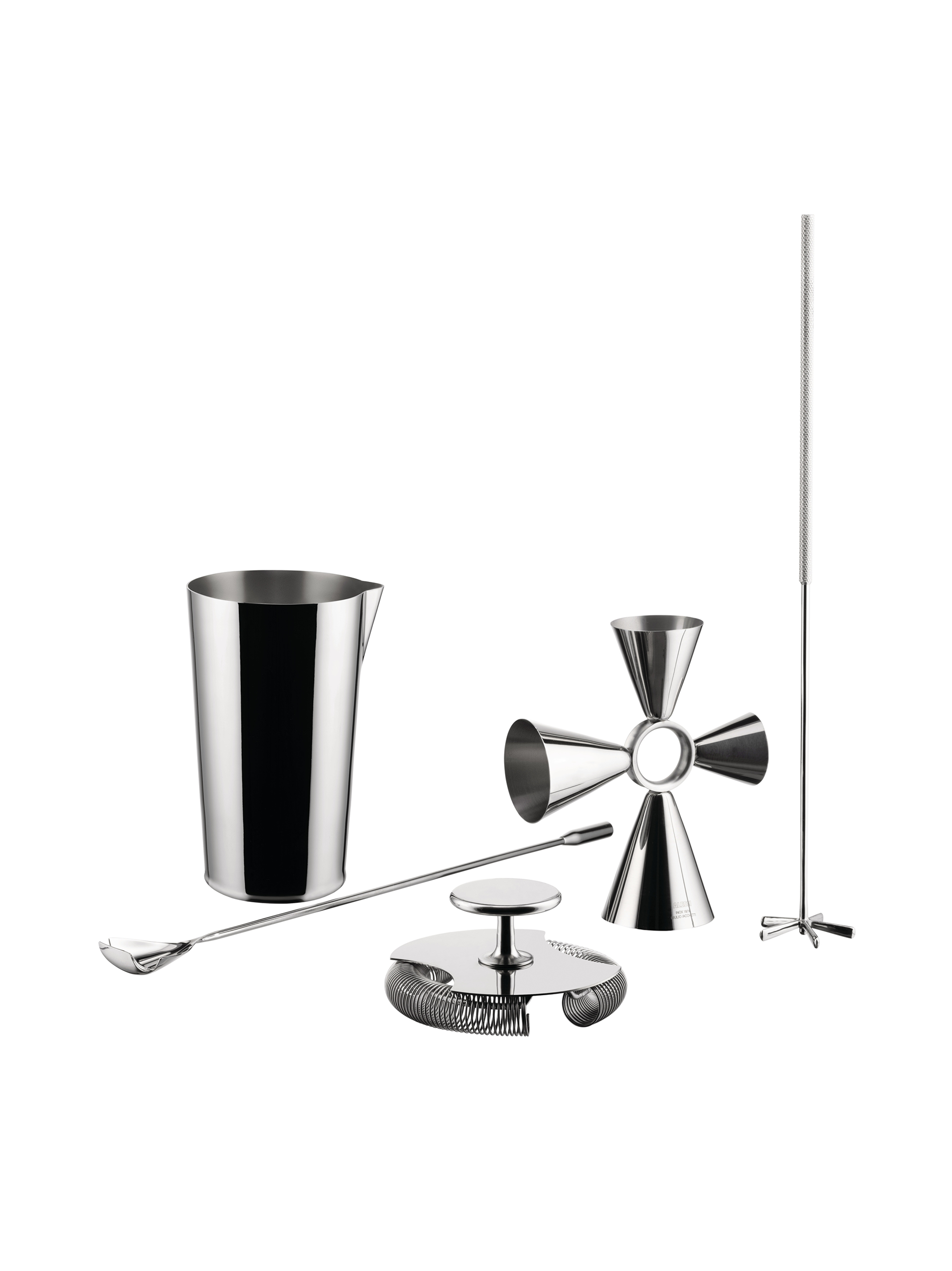 Dieses Set für die Zubereitung von Cocktails wurde von Giulio Iacchetti in Zusammenarbeit mit dem Mixologen Oscar Quagliarini entworfen und besteht aus sechs Objekten: Cocktailshaker, Barsieb, Rührglas, Cocktail-Messbecher, Rührlöffel und Barschneebesen.