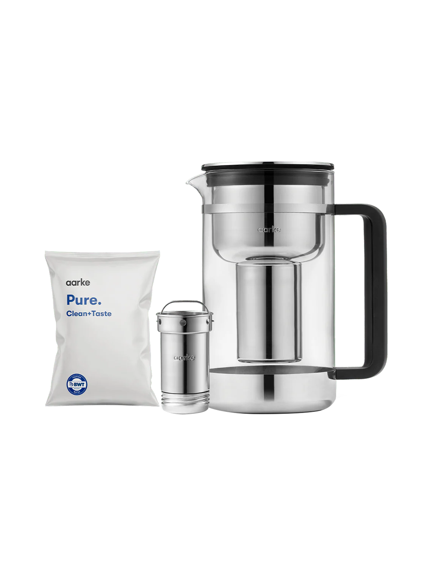 Der Purifier Large ist eine Glaskaraffe ohne Plastikpatronen, die fast 1,7 Liter gefiltertes Wasser fasst. Statt Einwegfilter nutzt er eine nachfüllbare Edelstahlkartusche mit Filtergranulat – umweltfreundlich und nachhaltig. Die gleiche Filtertechnologie wie beim originalen Purifier sorgt dafür, dass Dein Leitungswasser sauber, klar und köstlich schmeckt. Der stabile Griff aus recyceltem Ocean-Bound-Plastik trägt das zusätzliche Gewicht problemlos und ist nachhaltig zertifiziert (obpcert.org). Das intelligente, nach innen gewölbte Deckeldesign passt in Kühlschränke mit einem Regal über 25 cm Höhe. Mit der manuellen Filterwechselanzeige weisst Du genau, wann das Granulat ausgetauscht werden sollte.