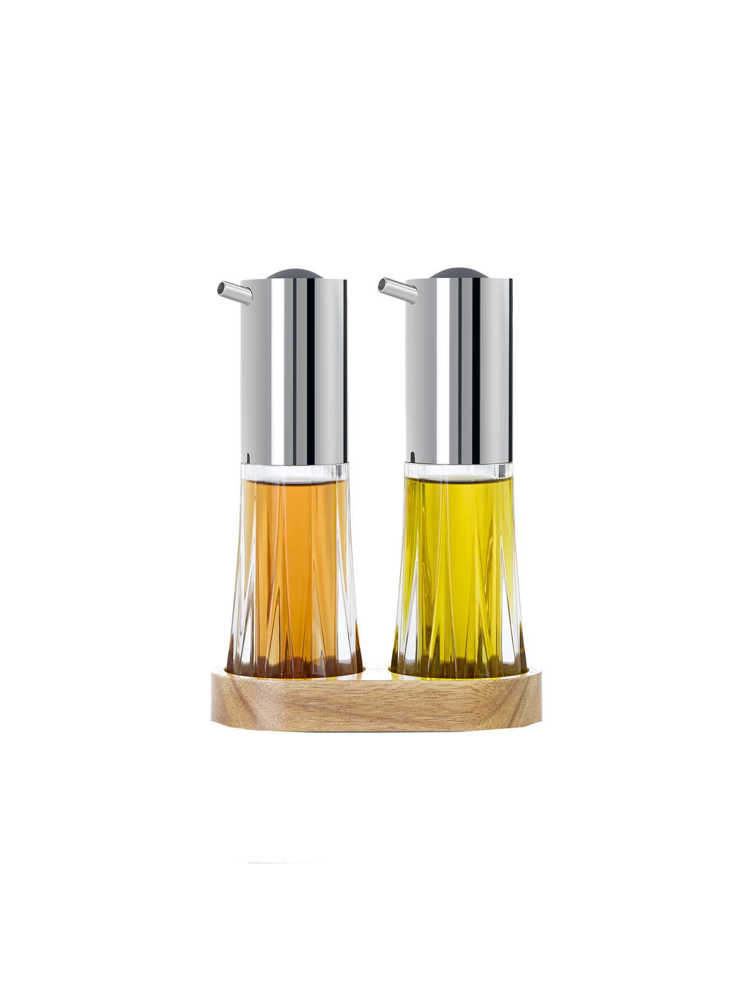 Die Öl- und Essigspender MENAGE CRYSTAL kombinieren dekoratives Design mit praktischer Funktionalität. Die Spender, deren Korpus aus Acryl an geschliffene Kelche erinnert, setzen bereits auf den ersten Blick einen optischen Leckerbissen auf den Tisch. Der dezent gehaltene Ständer aus edlem Akazienholz fungiert nicht nur als robuste Basis für die Spender, sondern schützt auch den Tisch vor Verschmutzungen.