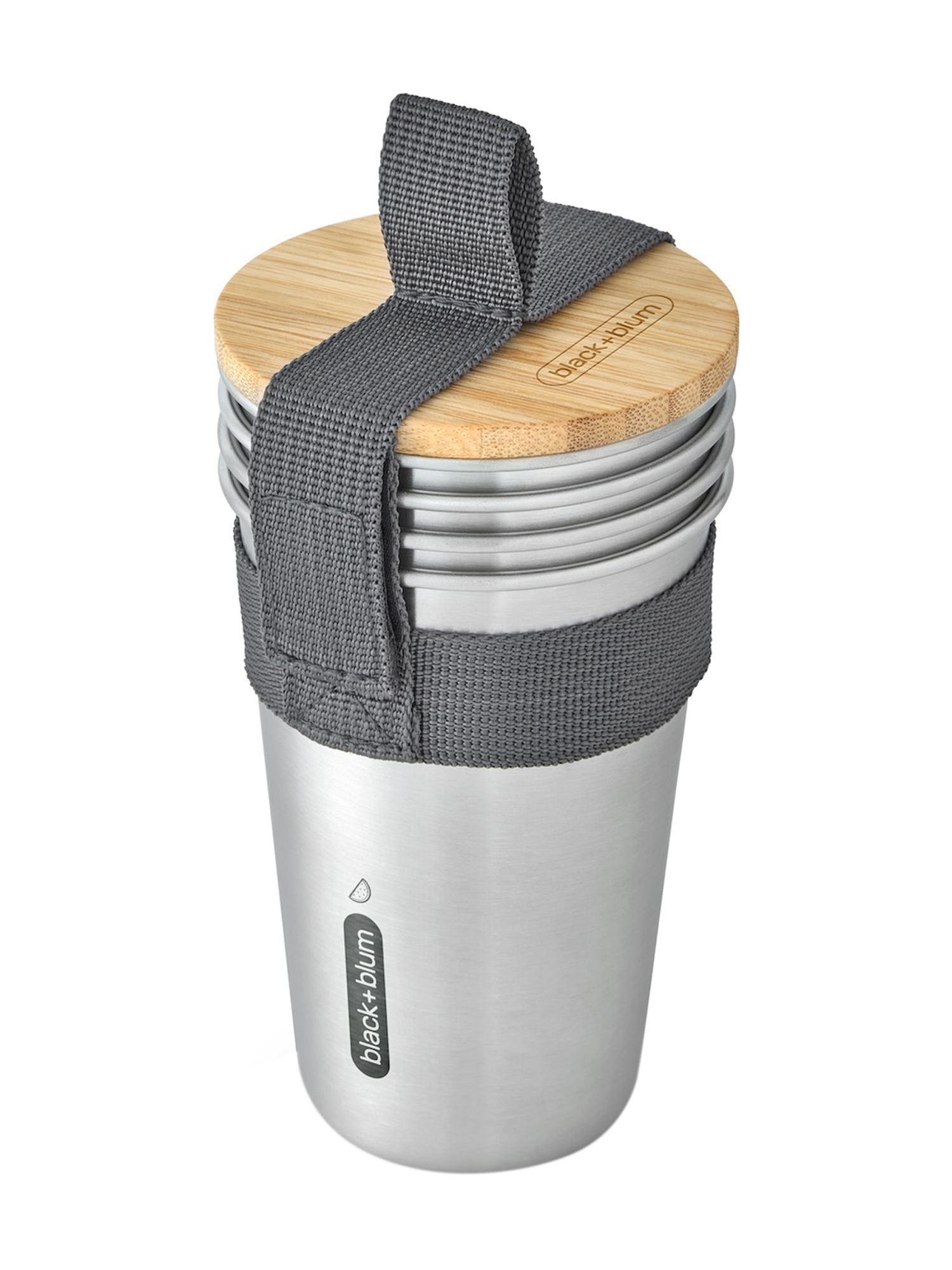 Der Deckel aus Bambusholz schützt die Becher vor Staub, lässt sich als Schneidebrett verwenden und verfügt über einen integrierten Flaschenöffner. Ein stabiler Haltegurt aus Nylon sorgt für einfachen Transport. Kleine Fruchtsymbole auf den Bechern erleichtern die Unterscheidung.