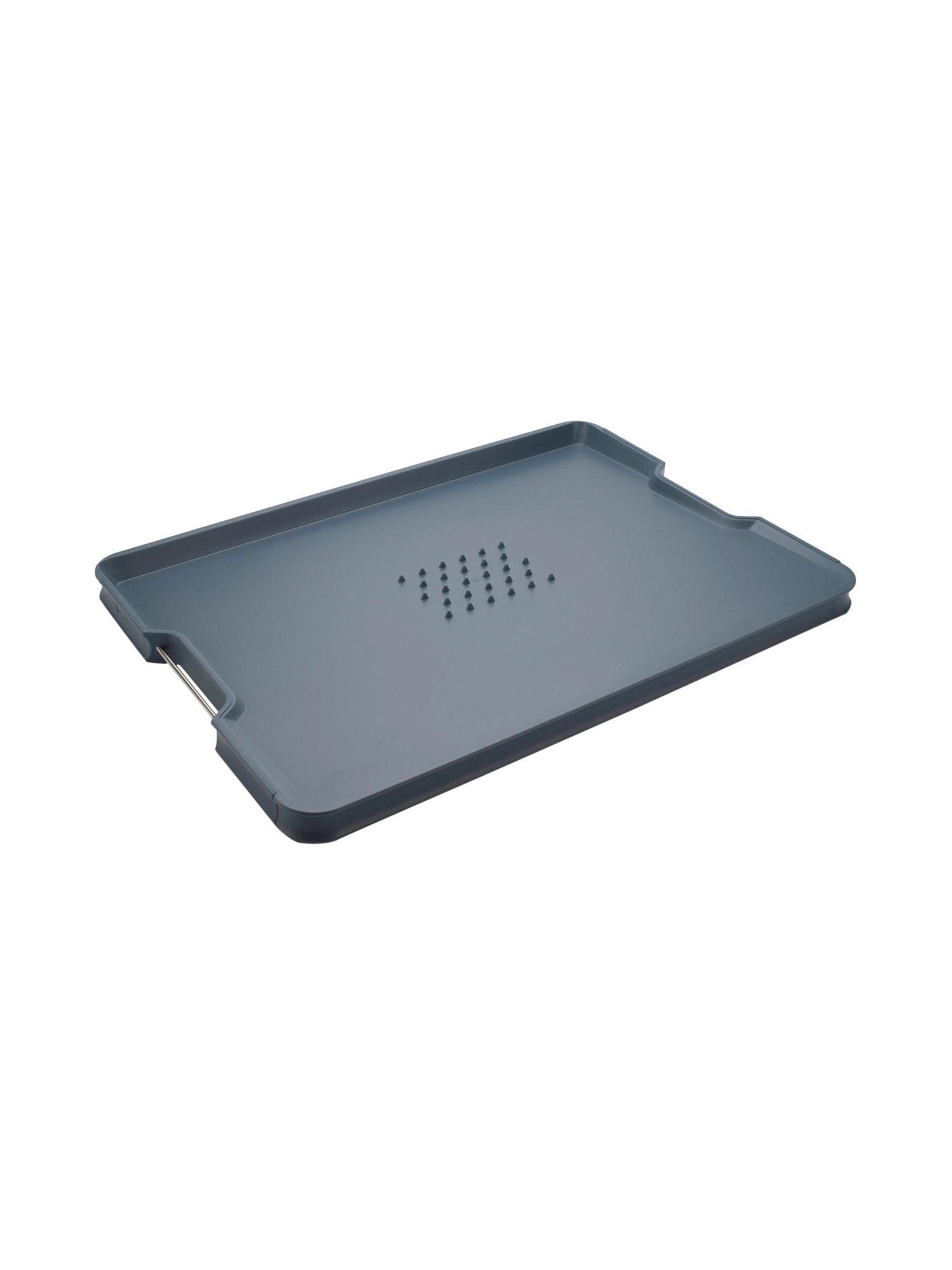 Das Joseph Joseph Cut & Carve Schneidebrett ist in einem markanten Blauton gehalten und verfügt über eine Vielzahl praktischer Eigenschaften. Die rutschfesten Ecken erleichtern das Handling und das Abgiessen von Flüssigkeiten. Zudem ist ein integrierter Griff für Fleisch vorhanden. Die Griffe bestehen aus Edelstahl und das Schneidebrett ist spülmaschinenfest.