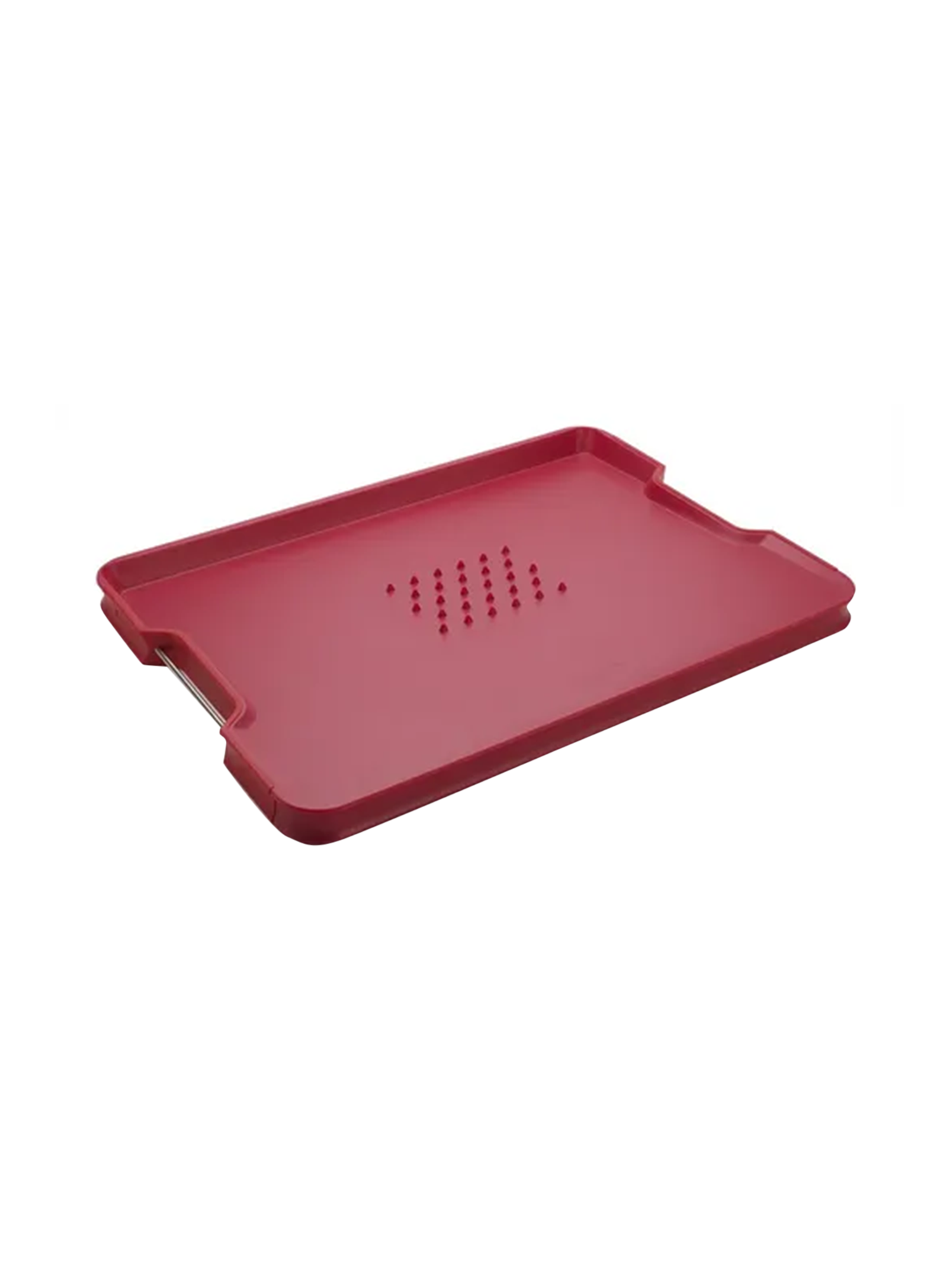 Das Brett verfügt über einen einzigartigen, abgewinkelten Boden, der das Ablaufen von Flüssigkeit ermöglicht, sowie über erhöhte Kanten und leicht abgeschrägte Ecken. Auf der einen Seite des Bretts befindet sich ein Fleischgriff, während die andere Seite eine glatte Schneidefläche aufweist. Rutschfeste Kanten sorgen dafür, dass das Brett während des Gebrauchs fest an seinem Platz bleibt.