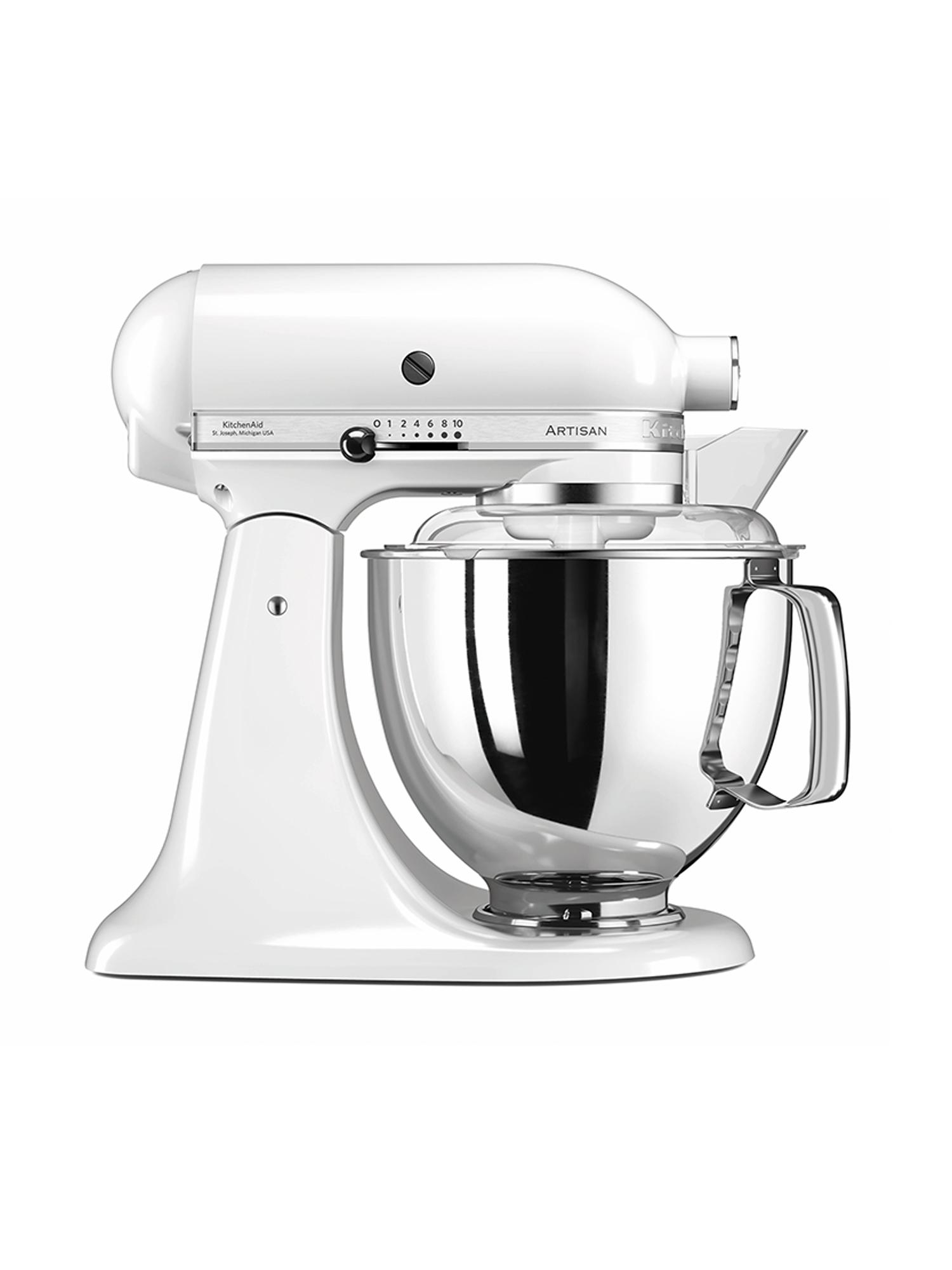 - Enthält Standardzubehör: 4.8 l Edelstahlschüssel, Schneebesen, Knethaken, Flachrührer, Flachrührer mit Schaber, Spritzschutz mit Einfüllschütte