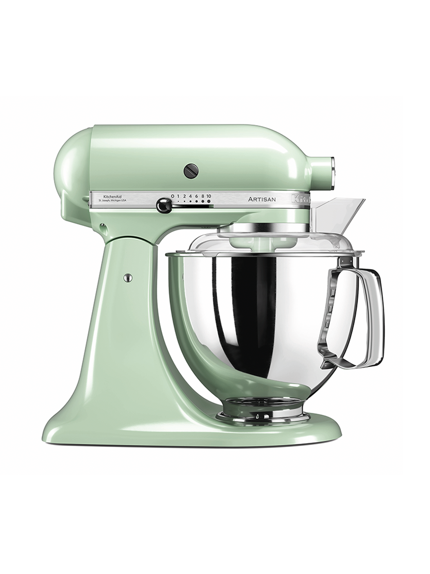 - Enthält Standardzubehör: 4.8 l Edelstahlschüssel, Schneebesen, Knethaken, Flachrührer, Flachrührer mit Schaber, Spritzschutz mit Einfüllschütte