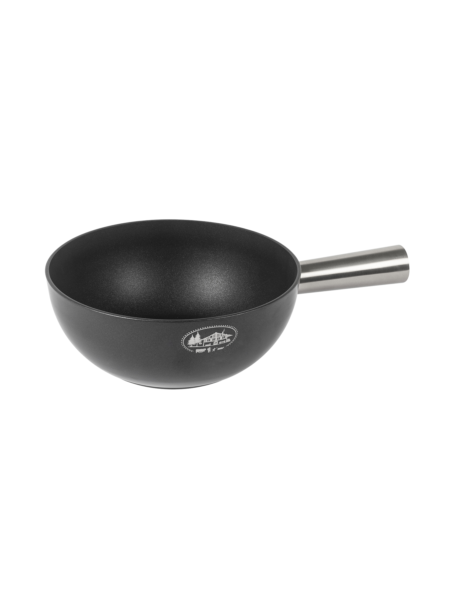 - Induktionstaugliches Caquelon aus Aluminium mit traditionellem Alpenhütten-Sujet