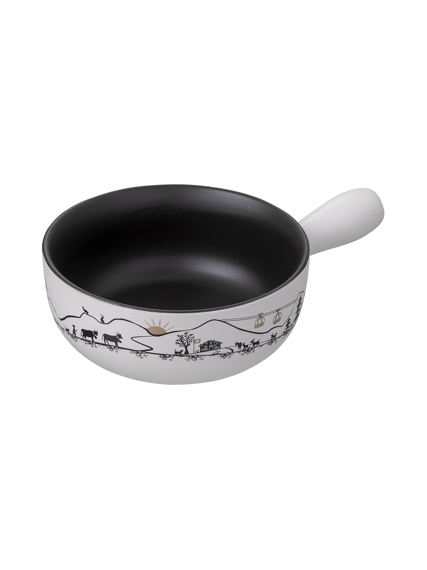 Steig ein und erlebe Fondue auf höchstem Niveau! Das Caquelon Gondel verzaubert mit einem modernen Alpenmotiv: goldene Gondeln, Gleitschirmflieger, Ziegen und eine charmante Alphütte auf weissem Grund. Innen schwarz matt, aussen weiss mit schwarzem Dekor und goldenen Akzenten – so wird jeder Fondue-Abend zum stilvollen Erlebnis.