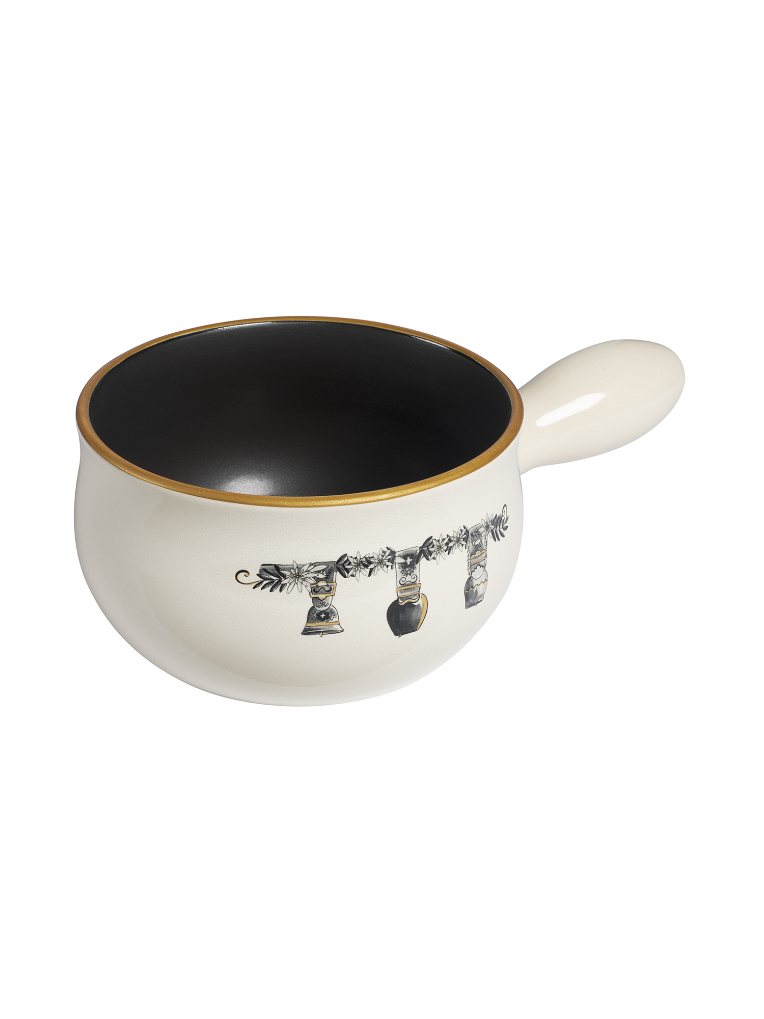 Hol dir Schweizer Klangkultur direkt auf den Tisch mit diesem limitierten Caquelon. Drei kunstvoll illustrierte Tricheln, geschmückt mit Edelweiss und Alpdetails, verbinden Tradition mit Eleganz – veredelt durch einen dezenten Goldrand. Handgefertigt aus hochwertiger Keramik in der Schweiz, ist jedes Stück ein Unikat. Mit 2,6 Litern Volumen ist das Fondue-Caquelon ideal für 4–6 Personen und bringt Genuss sowie Schweizer Charme in deine Küche.