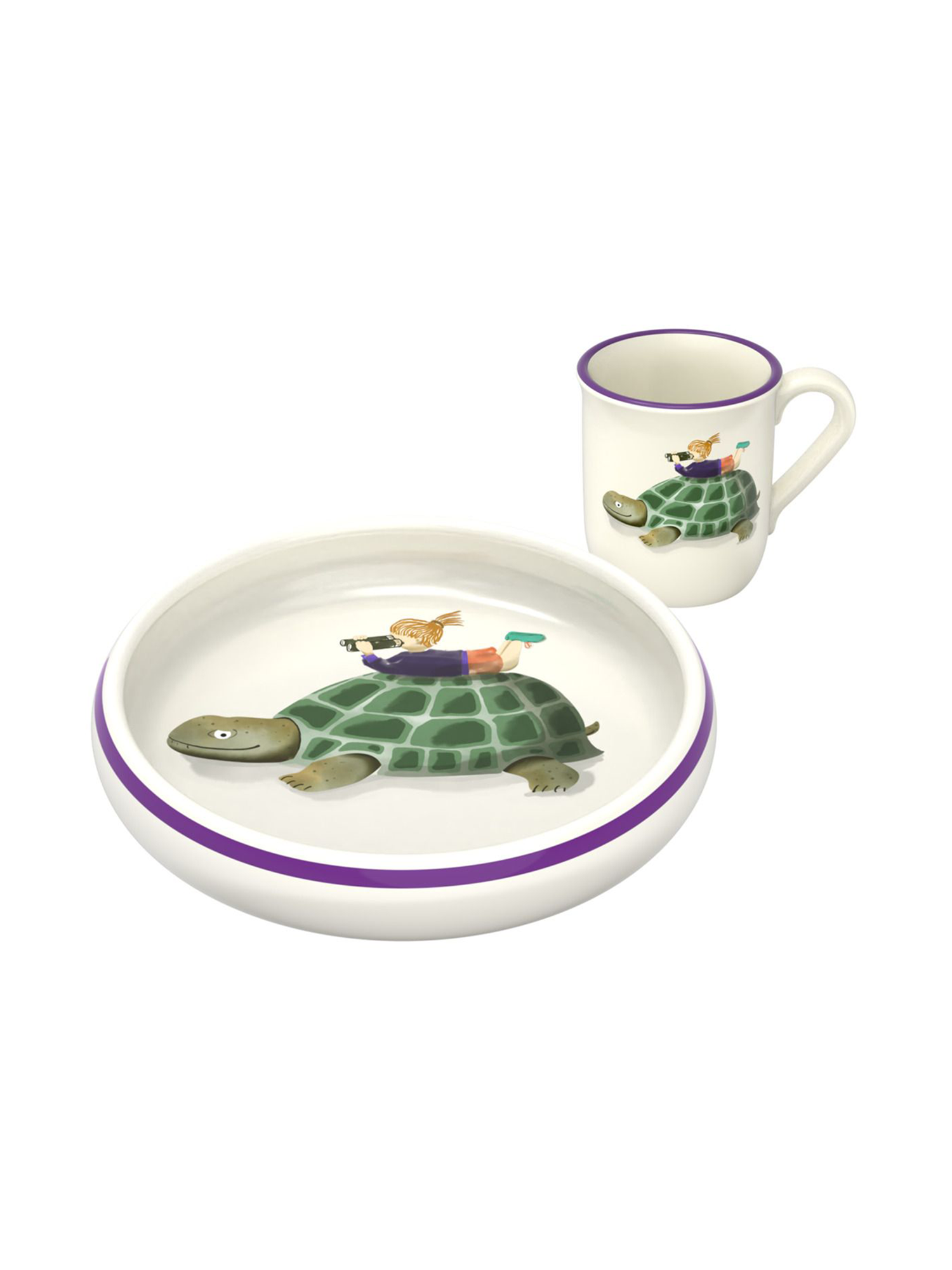 Mit dem liebevoll gestalteten Set aus Teller und Tasse nimmst du dir Zeit für die kleinen Wunder des Alltags. Das Kind auf der grossen Schildkröte lädt dich ein, innezuhalten, zu staunen und die Welt mit neugierigen Augen zu sehen. Ganz nach dem Motto: Du bist nie allein.