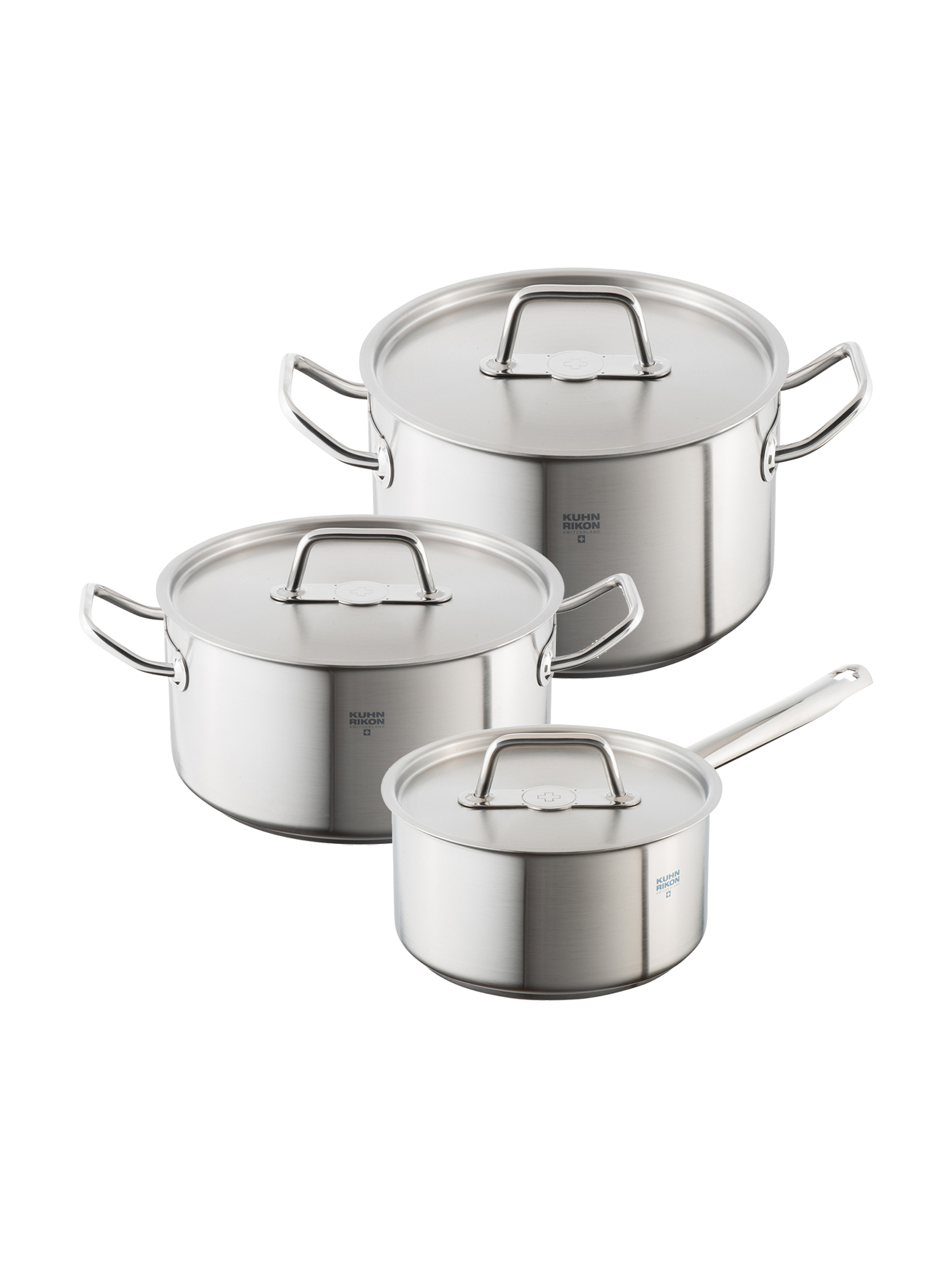 Das Kochgeschirr Set Montreux lässt Ihre Kochliebe neu entflammen. Das Set besteht aus einem Topf mit 1,5 Litern Fassungsvermögen, einem Topf mit 3 Litern Fassungsvermögen und einem Topf mit 6 Litern Fassungsvermögen. Sie sind aus hochwertigem Edelstahl gefertigt und damit widerstandsfähige und langlebige Begleiter in der Küche. Der Superthermic-Sandwichboden sorgt für eine rasche und gleichmässige Hitzeverteilung. Die zugehörigen Edelstahlgriffe sind ergonomisch und zugleich robust. Der Schüttrand ermöglicht ein einfaches und dosiertes Ausgießen. Die Schweizerkreuz-Prägung an den Seitengriffen sowie die Ausstanzung an den Stielgriffen stehen für die zeitlose Eleganz dieser Linie. Dank der Liter-Innenskalierung kann direkt in der Pfanne die Flüssigkeitszugabe abgemessen werden. Für alle Herdarten geeignet – auch Induktion. Übrigens: Alle Produkte von Kuhn Rikon werden durch die hausinterne Qualitätssicherung und das eigene Labor mehrfach getestet bevor sie in den Verkauf gelangen. Und alle Swiss-Made-Produkte werden einer 100-Prozent-Kontrolle unterzogen.