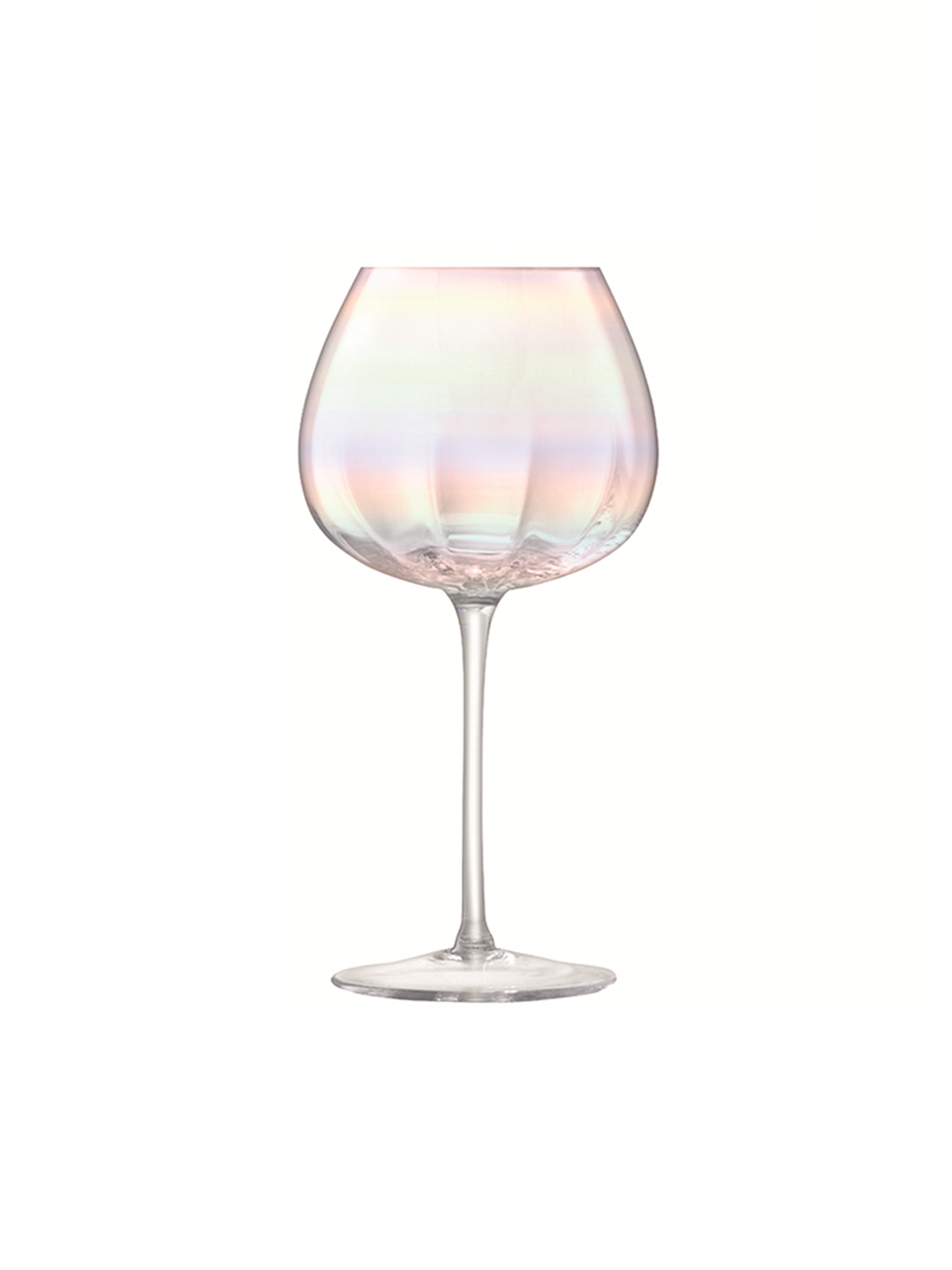 Ein Set aus vier mundgeblasenen Weingläsern mit einer grosszügigen Schale und einer subtilen geriffelten Textur, die zum Rand hin verblasst. Die Gläser wurden von Hand mit schillerndem Glanz bemalt und sind eine atemberaubende Ergänzung für Ihre Hausbar.