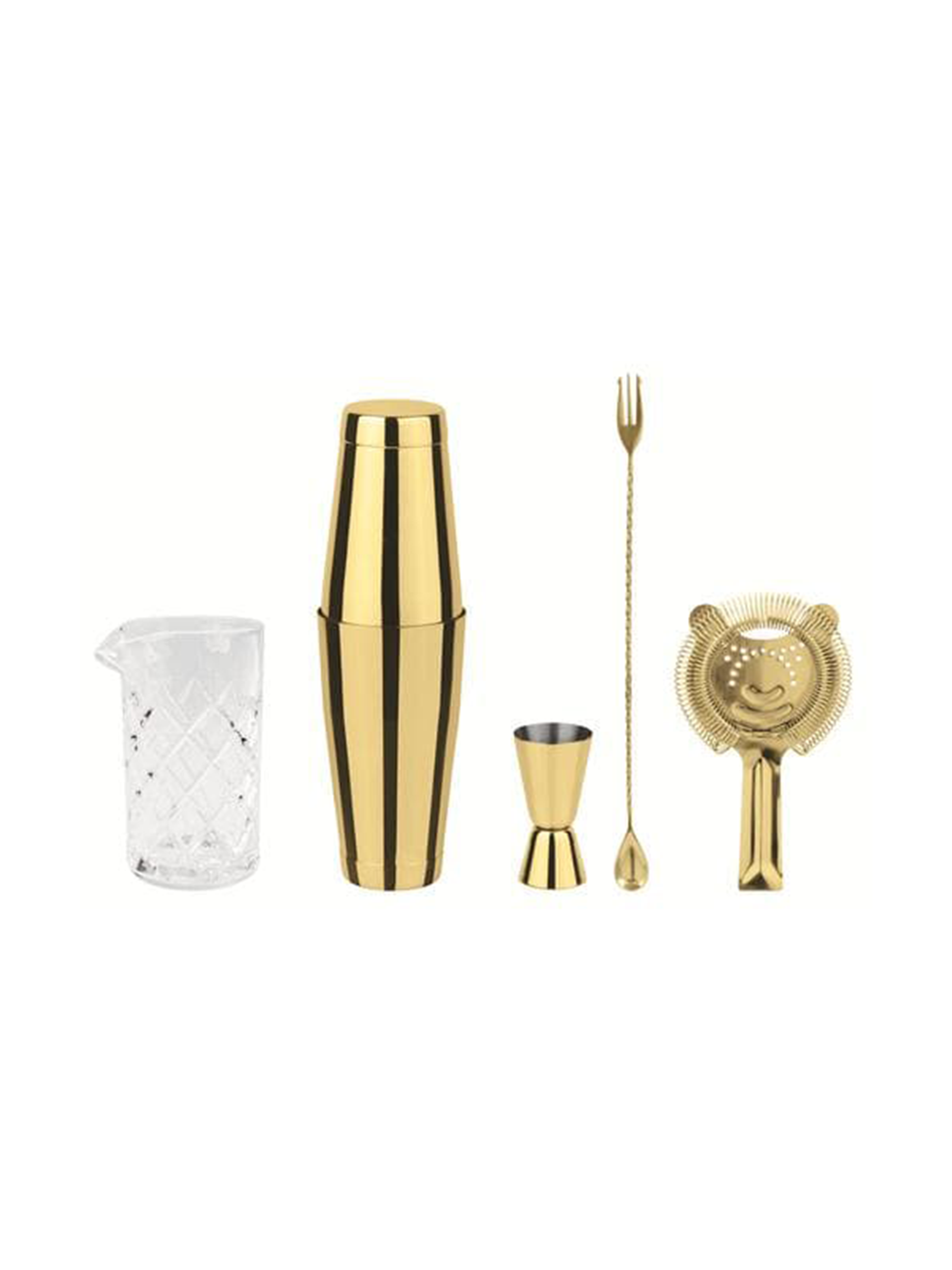 Mit diesem Drink Mixer Set Crystal von Paderno mischen Sie nicht nur eigenständig Ihre liebsten Cocktails, sondern fügen der Hausbar auch einen Hauch von Glanz und Glamour hinzu. Mit der hochwertigen Karaffe können Sie Ihre köstlichen Getränke-Kreationen servieren, nachdem Sie den Shaker, Löffel beziehungsweise Gabel und Jigger für die Abmessung, das Mischen und die Filterung der Zutaten verwendet haben. Das vergoldete Edelstahl ist nicht nur robust und langlebig, es verleiht der heimischen Cocktail-Lounge auch eine luxuriöse Note.