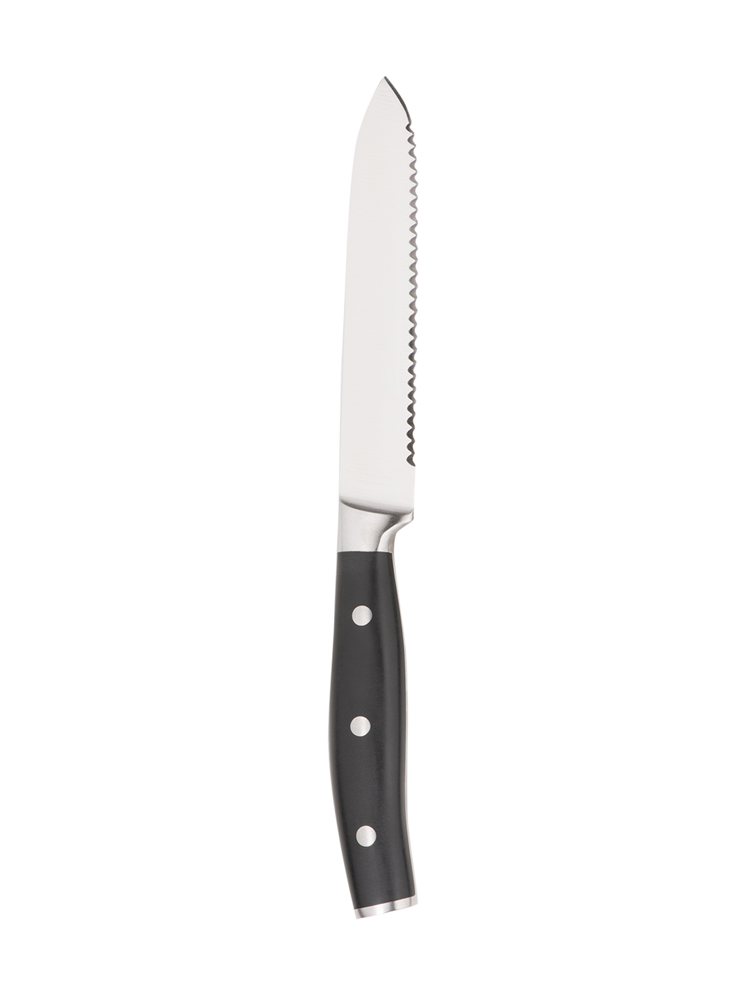 Das Universalmesser ist aus gehärtetem Spezialklingenstahl X50CrMoV15 gefertigt, ist lebenmittelecht und hat einen ergonomischen Griff aus Edelstahl. Der Wellenschliff schneidet sicher, ohne abzurutschen oder zu zerquetschen und ist damit ideal für frisches Obst, Gemüse mit harter Schale und weichem Kern, Tomaten oder Wurstwaren wie Salami. Handwäsche wird empfohlen.