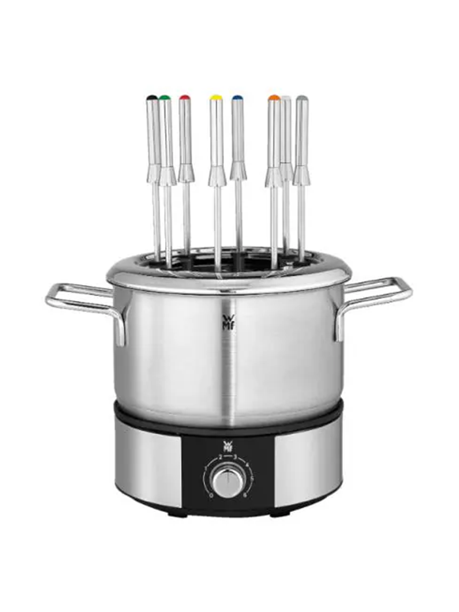 Mit dem WMF Lono Fondue-Set wird das gemeinsame Essen zu einem sinnlichen und unterhaltsamen Erlebnis. Das Essen und Geniessen stehen dabei im Mittelpunkt, während man mit Bedacht und jeder Menge Spaß gemeinsam speist. Das Set enthält acht Gabeln, die in verschiedenen Farben markiert sind, sodass man sofort erkennen kann, wem welches Fleisch- oder Gemüsestück gehört. Jede Gabel hat ihre eigene Aufnahme, um ein Verhaken zu vermeiden und eine bequeme Handhabung zu gewährleisten. Die individuell einstellbare Temperaturregelung ermöglicht einen einfachen Wechsel von schnellem Aufheizen zu optimaler Zubereitungstemperatur. Der Fonduetopf aus robustem Cromargan verleiht herzhaften Öl- und Brühe-Fondues nicht nur eine ansprechende Optik, sondern bietet auch langlebige Qualität. Die Lono Kollektion von WMF bietet praktische und leistungsstarke Geräte, die sich nahtlos in jede Küchenumgebung integrieren lassen. Mit ihren eleganten und dennoch robusten Gehäusen aus Cromargan vereinen sie klare Linien und innovative Formen. Diese Kombination aus Leistung, Design und Langlebigkeit ist typisch für WMF Küchengeräte.