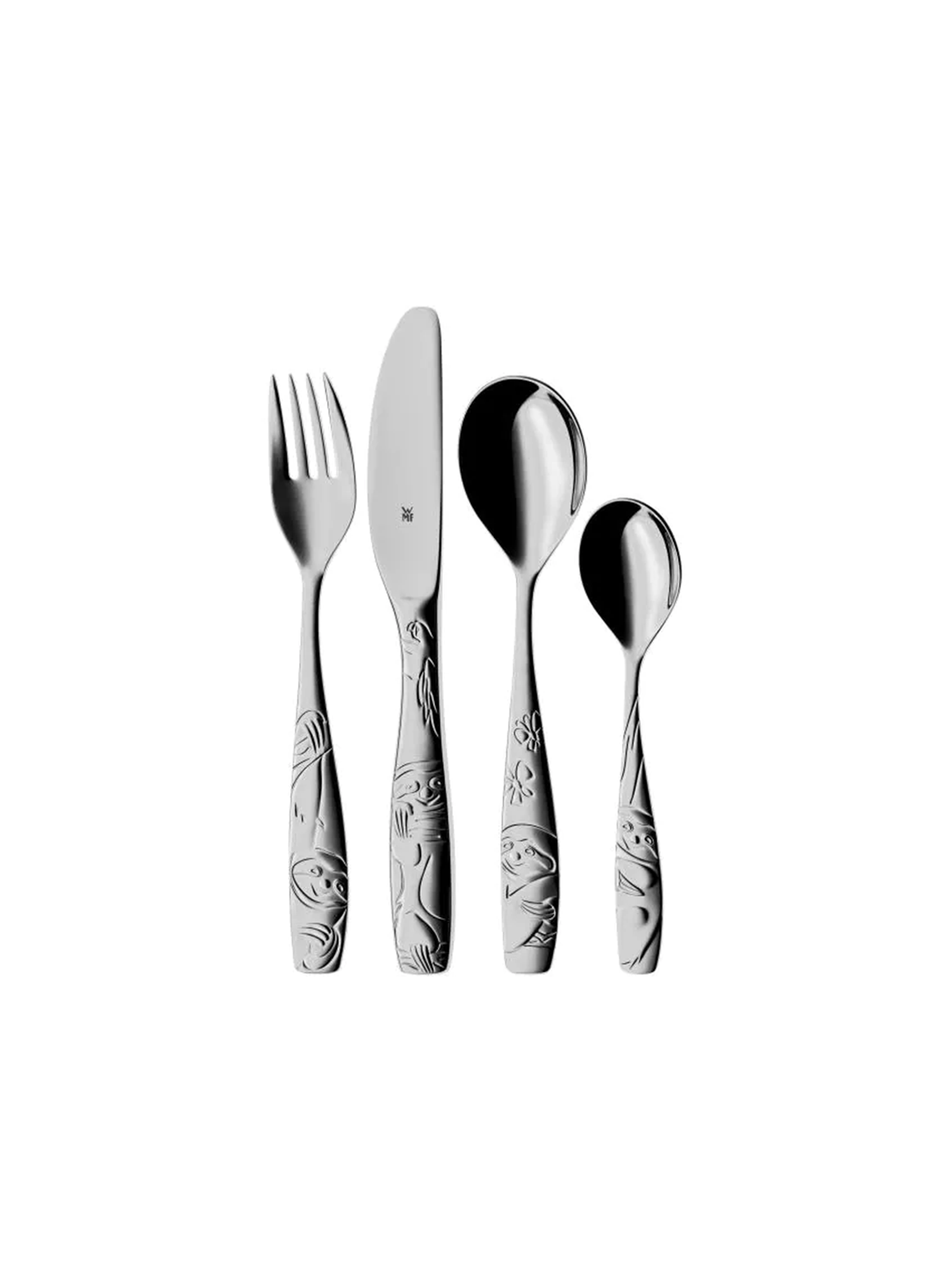 - 4-teiliges Kinderbesteck-Set Tommi das Faultier: Kindergabel, Kindermesser, Kinderlöffel, kleiner Kinderlöffel mit aufwändig geprägten Motiven