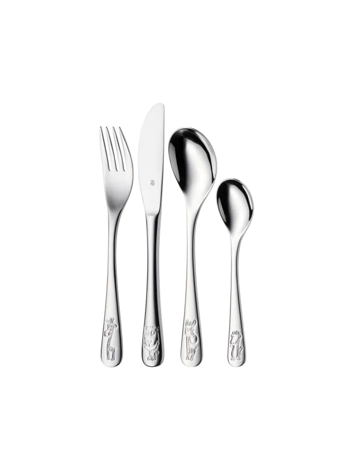 Mit dem Kinderbesteck Safari von WMF macht Ihrem Kind das Essen mit Messer, Gabel und Löffel doppelt so viel Spass. Das vierteilige Set besteht aus einem Suppenlöffel, einem kleinen Löffel, einem Messer und einer Gabel, die ergonomisch geformt auf die kleinen Kinderhände abgestimmt sind. Sie bestehen aus hochwertigem Edelstahl, sind formstabil, rostfrei und spülmaschinengeeignet. Das Messer ist mit einem leichten Wellenschliff versehen, die Zinken der Gabel sind stumpf und der Löffelrand ist abgerundet, um Verletzungen zu verhindern.