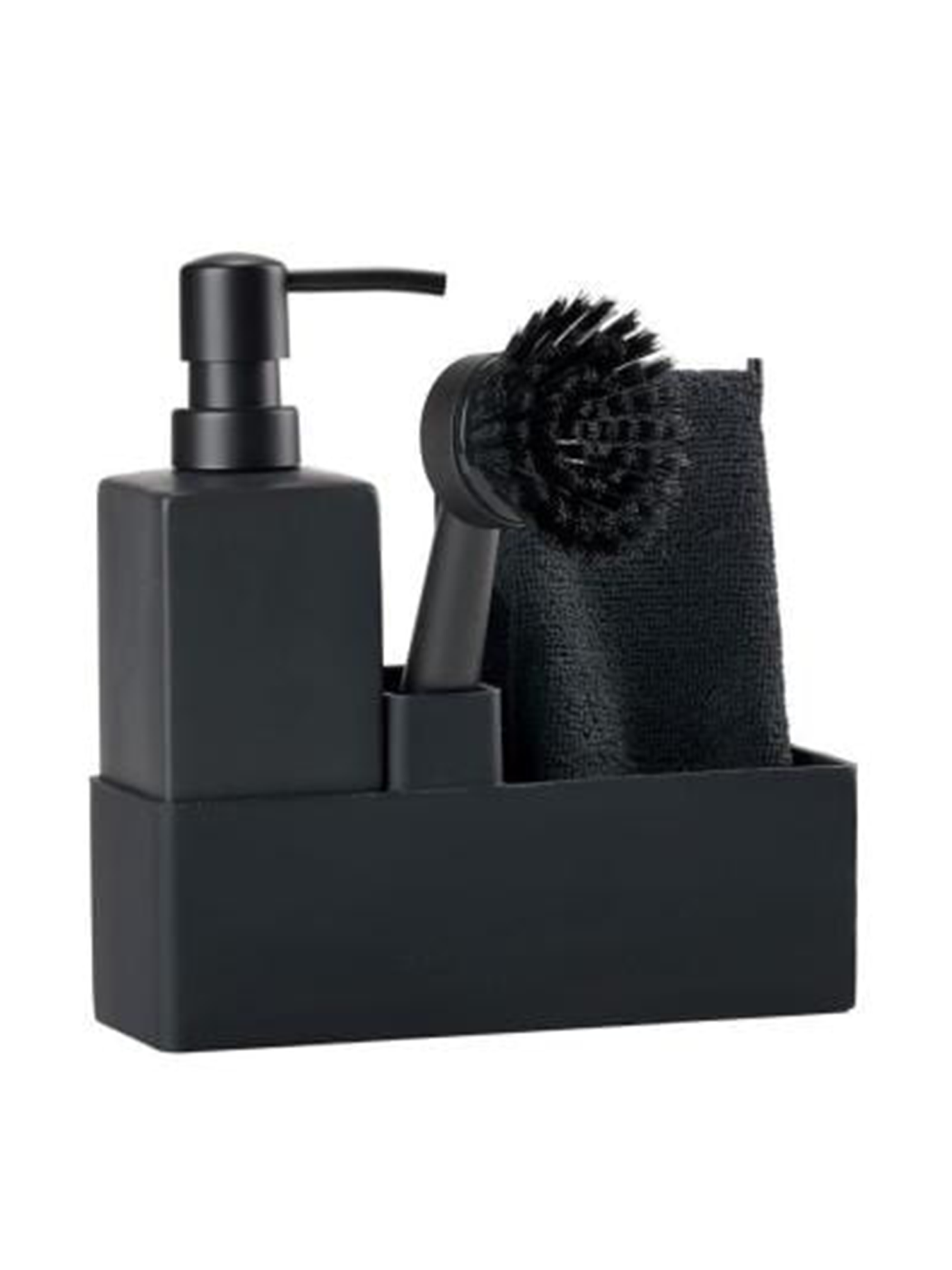 - Vierteilige Set enthält Spülmittelspender, Geschirrbürste und passenden Lappen