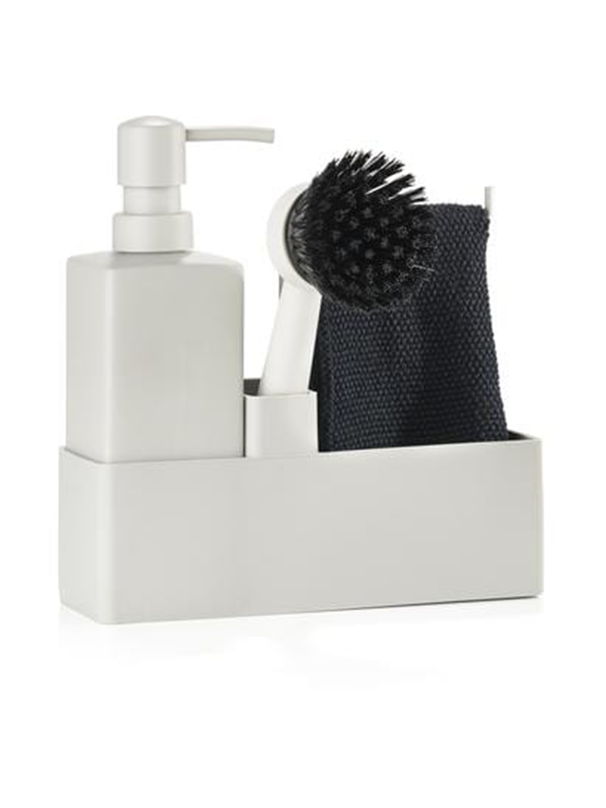 Das vierteilige Set beinhaltet einen Spender für das Spülmittel sowie eine Geschirrbürste und einen passenden Lappen, die alle in der zugehörigen Aufbewahrung Platz finden.