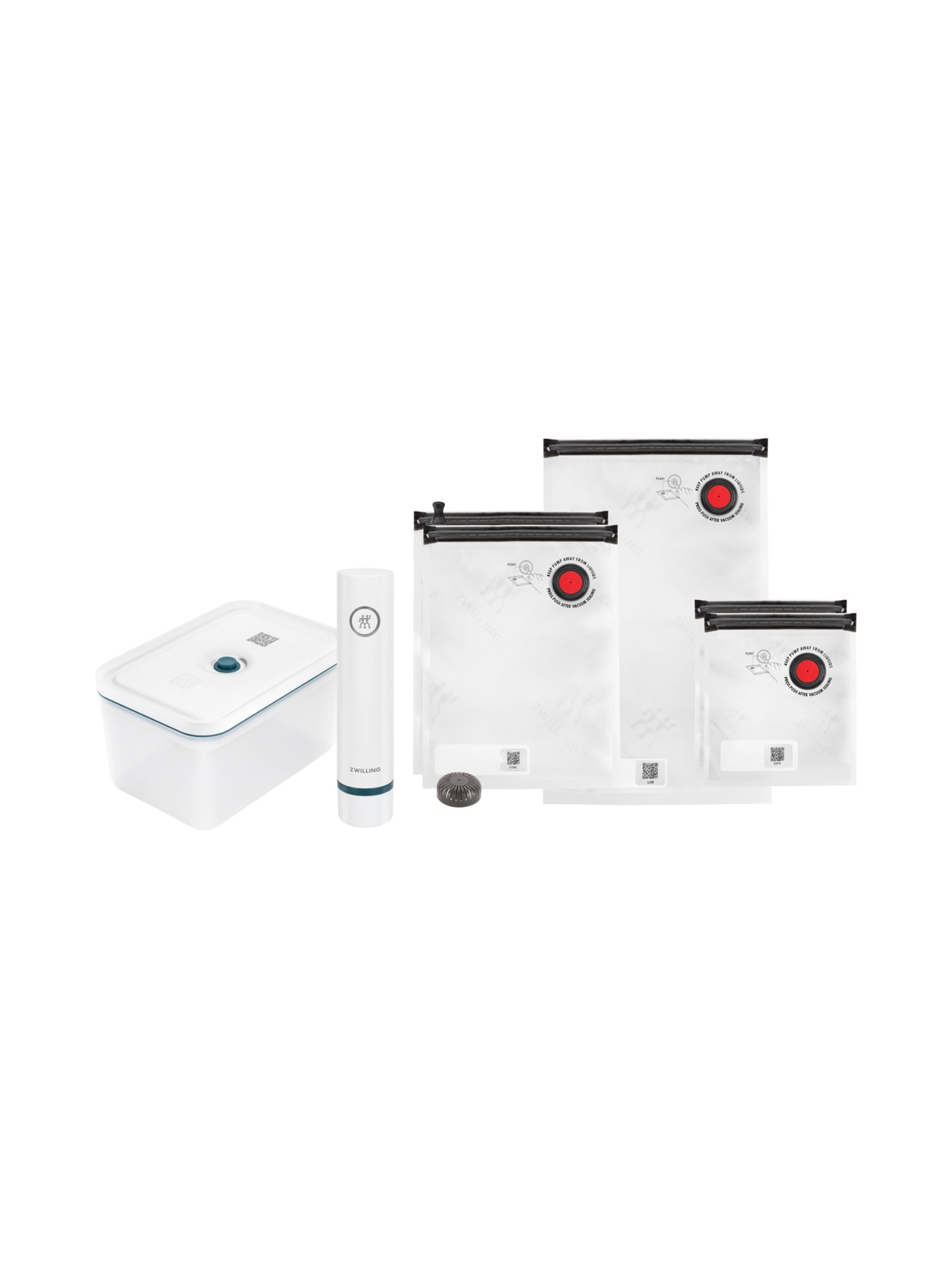 Spare Zeit, Geld und verhindere Lebensmittelverschwendung – mit dem ZWILLING Fresh & Save Starter Set Kunststoff. Die grosse Vakuum-Box, fünf wiederverwendbare Beutel und die kabellose, leistungsstarke Vakuumpumpe halten deine Lebensmittel bis zu fünfmal länger frisch. Ob Obst, Gemüse, Fleisch oder Fisch – vorbereitete Mahlzeiten bleiben Tage später so lecker wie frisch gekocht. Sous-vide garen, marinieren oder einfrieren? Kein Problem! Auf Knopfdruck erzeugt die Pumpe das Vakuum und stoppt automatisch. Mit der kostenlosen ZWILLING Culinary World App scannst du einfach den QR-Code auf dem Deckel, behältst den Überblick über deine Vorräte und erhältst Erinnerungen, wann Lebensmittel verzehrt werden sollten.