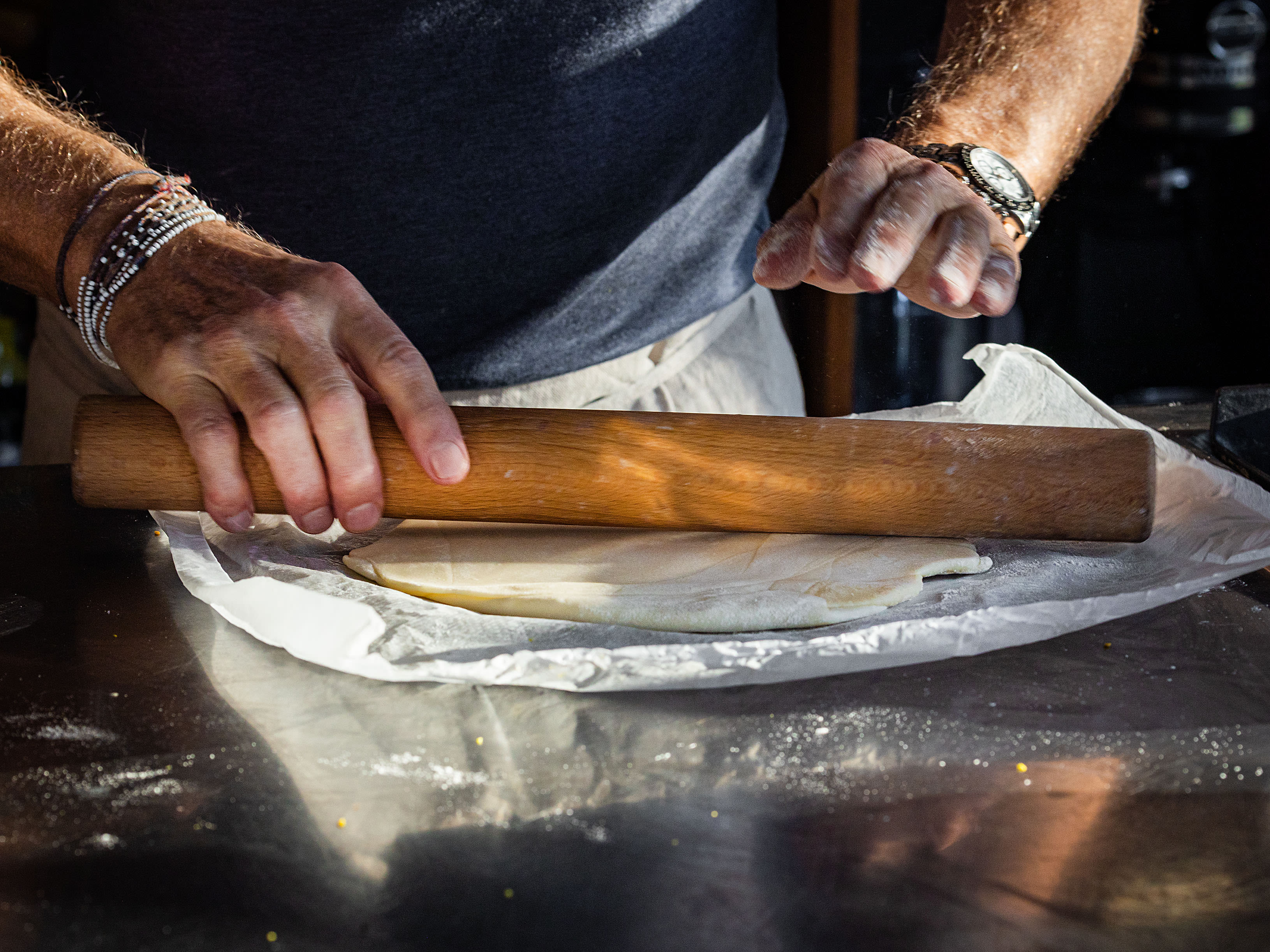 Mehl mit weicher Butter, Salz und Zucker von Hand gut zu einer gleichförmig krümeligen Masse zusammenfügen. Wenig Wasser zugeben, den Teig zu einer Kugel formen und 30 Minuten kalt stellen. Danach in vier Teile schneiden und diese kreisrund – passend auf die Grösse der Backformen – ausrollen. Die mit Teig ausgelegten Formen in Backpapier wickeln, wieder 30 Minuten kaltstellen.