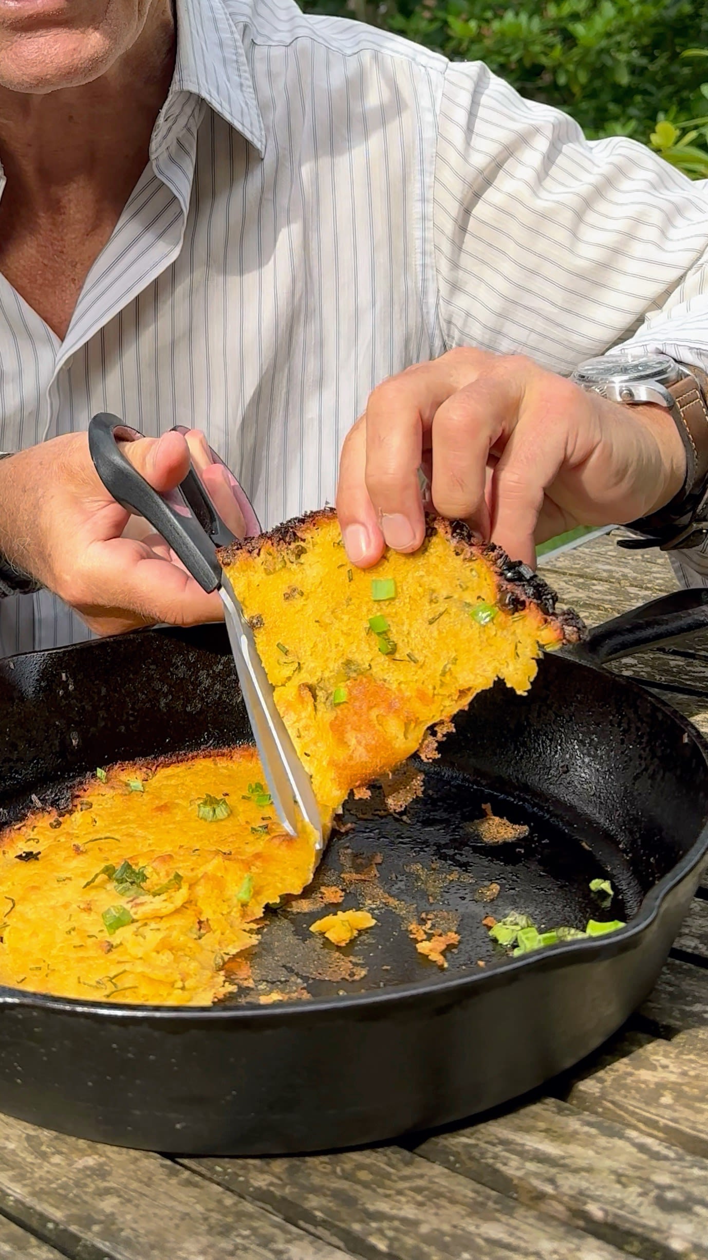 Das Öl in die Pfanne geben, etwas Frühlingszwiebeln und Rosmarin dazugeben und im Ofen kurz anbraten. Den flüssigen Teig nochmals umrühren und 6 mm hoch in die Pfanne giessen. Mit einem Holzspatel den Teig einmal vorsichtig durch die Pfanne ziehen, sodass ein Teil des Öls aufsteigt. Im Ofen je nach Ofentemperatur 6-10 Minuten goldbraun backen. Direkt in der Pfanne mit einem Teigschaber oder einer Palette in Stücke teilen, mit frischen Lauchzwiebeln bestreuen und sofort servieren. Für den nächsten Fladen die Pfanne wiederum ein paar Minuten im Ofen heiss werden lassen.