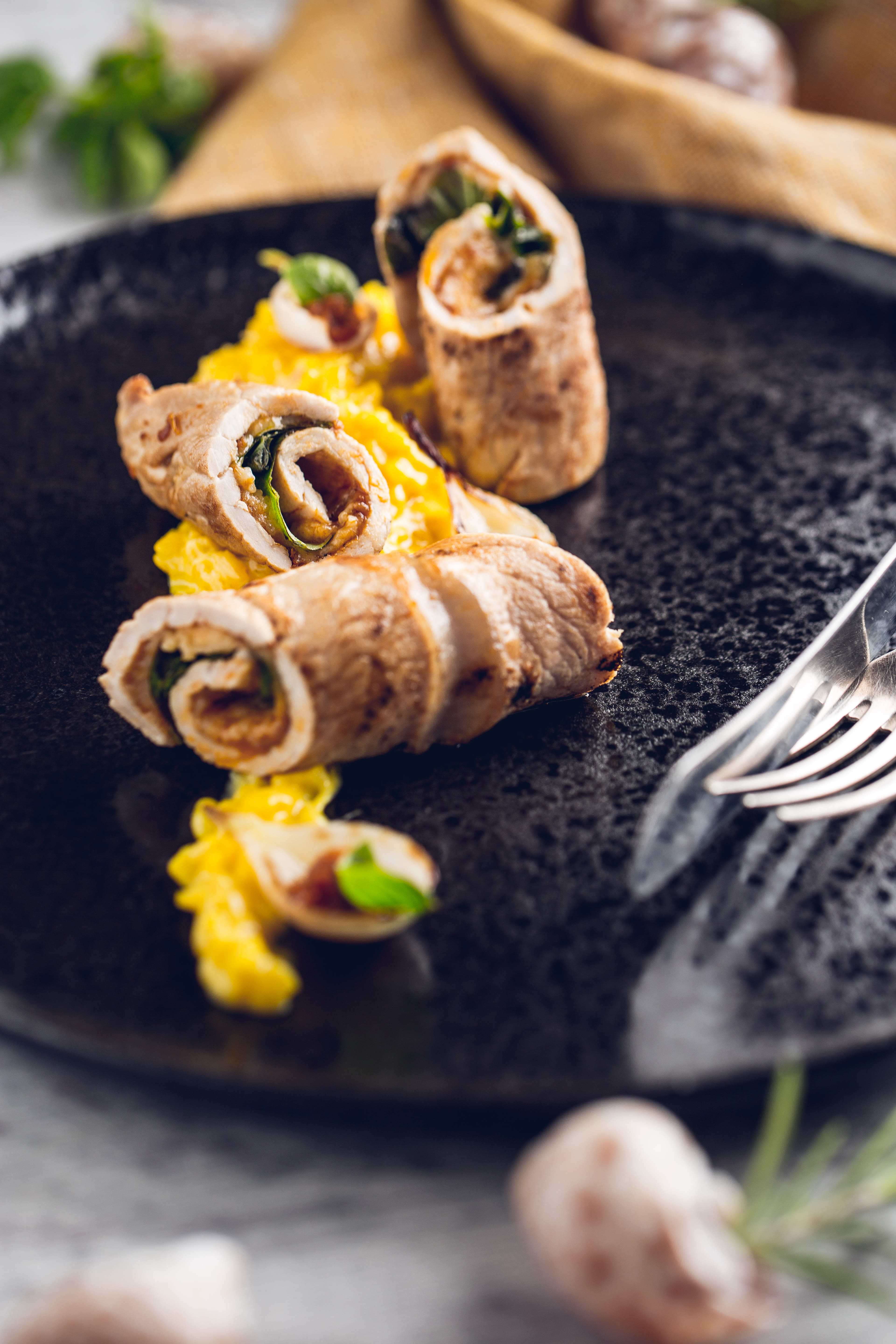 Diese Variante der klassischen italienischen Kalbfleisch-Röllchen begeistert mit feinen mediterranen Kräuteraromen. Für die Kalbs-Involtini werden Basilikum, Thymian, Pinienkerne und Parmesan in Kalbsrücken-Scheiben eingerollt. Perfekt zu diesem Involtini-Rezept passt ein saftiges Safranrisotto, das mit seiner leuchtend gelben Farbe das frische Aroma des sommerlichen Gerichts perfekt unterstreicht.