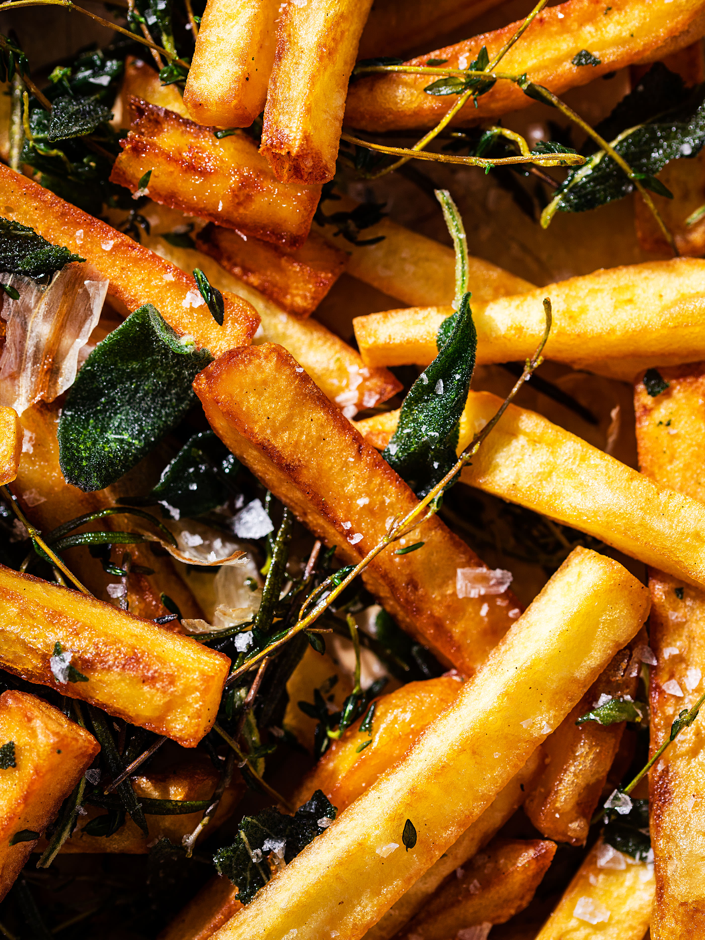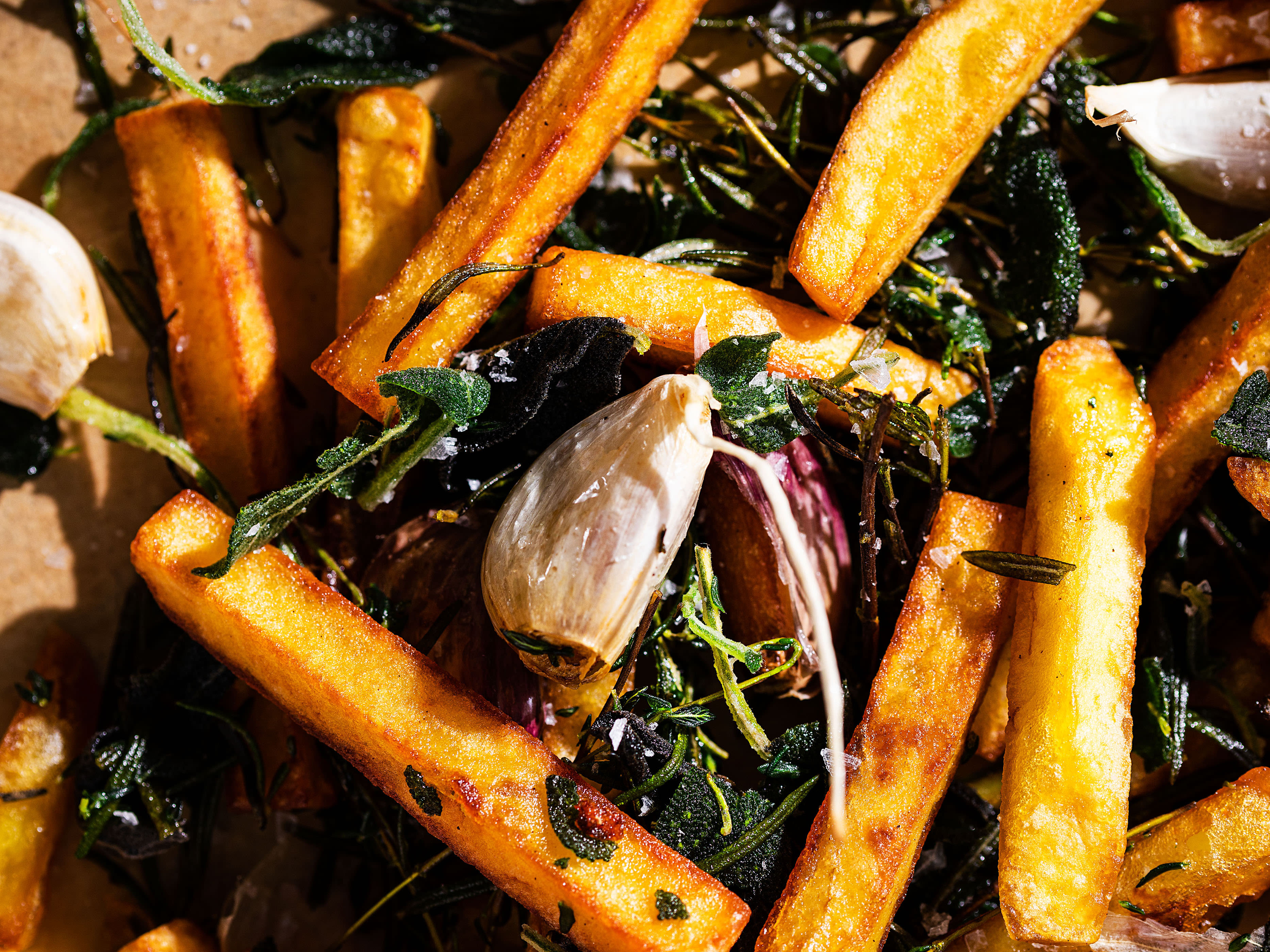 Nun das Öl auf 180 °C erhitzen und Pommes hineingeben. Nach 3 Minuten die ungeschälten Knoblauchzehen hinzufügen. Alles sanft umrühren und die Pommes samt Knoblauch für weitere 5 Minuten garen. Immer die Temperatur im Auge behalten und sicherstellen, dass der Knoblauch nicht verbrennt und die Pommes nicht zu dunkel werden. Sind sie hellgold und noch knackig, die Kräuter hineinwerfen. Nach 1 Minute die Pommes herausheben und auf zwei Lagen Küchenpapier abtropfen. Meersalz darüber streuen und heiss servieren.