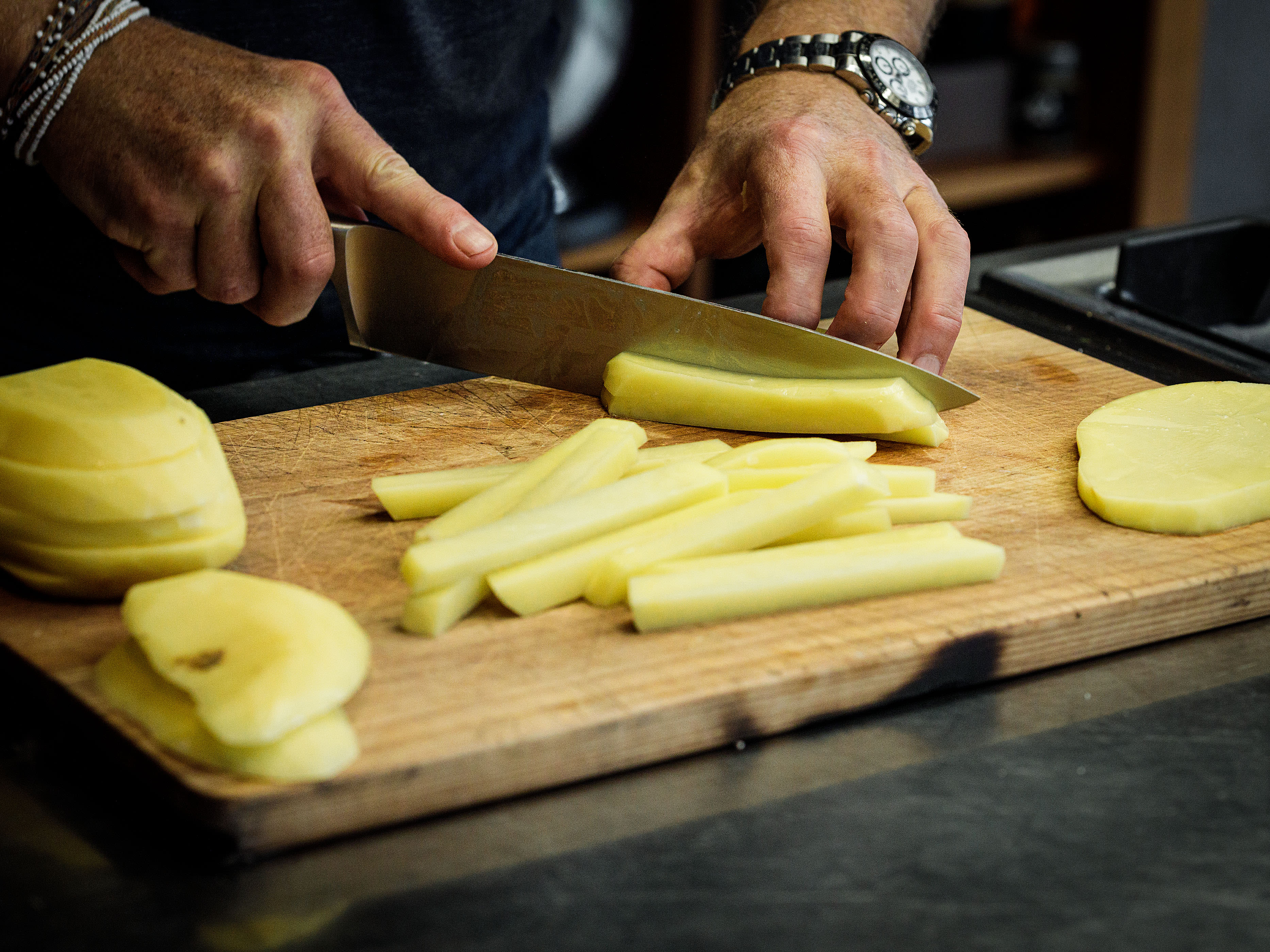 Kartoffeln schälen oder ungeschält lassen. Oben und unten gerade abschneiden, dann in 1 cm dicke Stäbchen schneiden. Auf einem Küchentuch gut abtupfen und trocknen lassen. Einen grossen, schweren Topf auf den Herd stellen und das Öl hineingiessen.